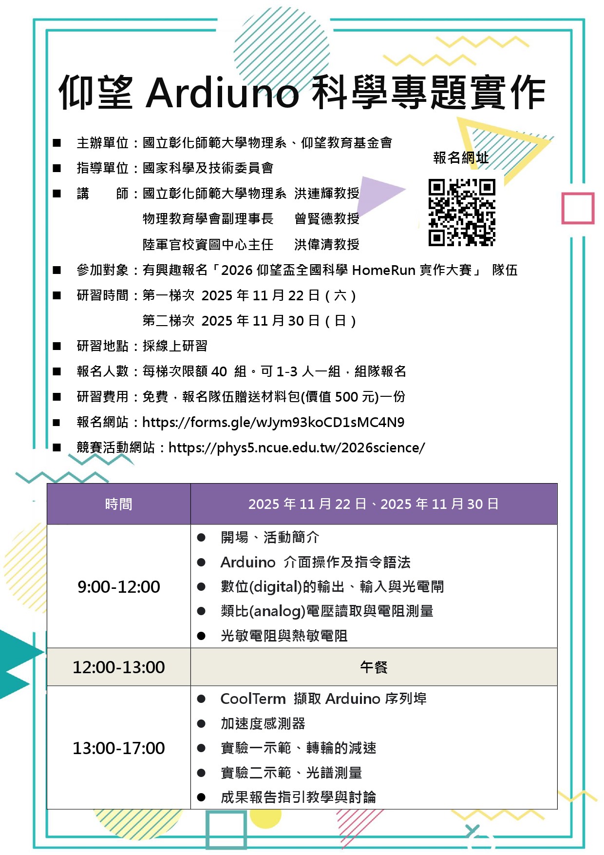 校園公告 公告主旨 仰望 Ardiuno 科學專題實作 發佈日期 2025 年 10 月 27 日 發佈單位 實驗研究組 公告類別 競賽活動&成果, 營會研習 公告等級 轉知 點閱次數 29 公告內容 相關附件 【2025-10-27】114學年度基督教協同高級中學59屆校際運動會秩序冊 【2025-10-22】生涯輔導資源中心【114年度生涯線上影展】暨觀後寫心得抽好禮