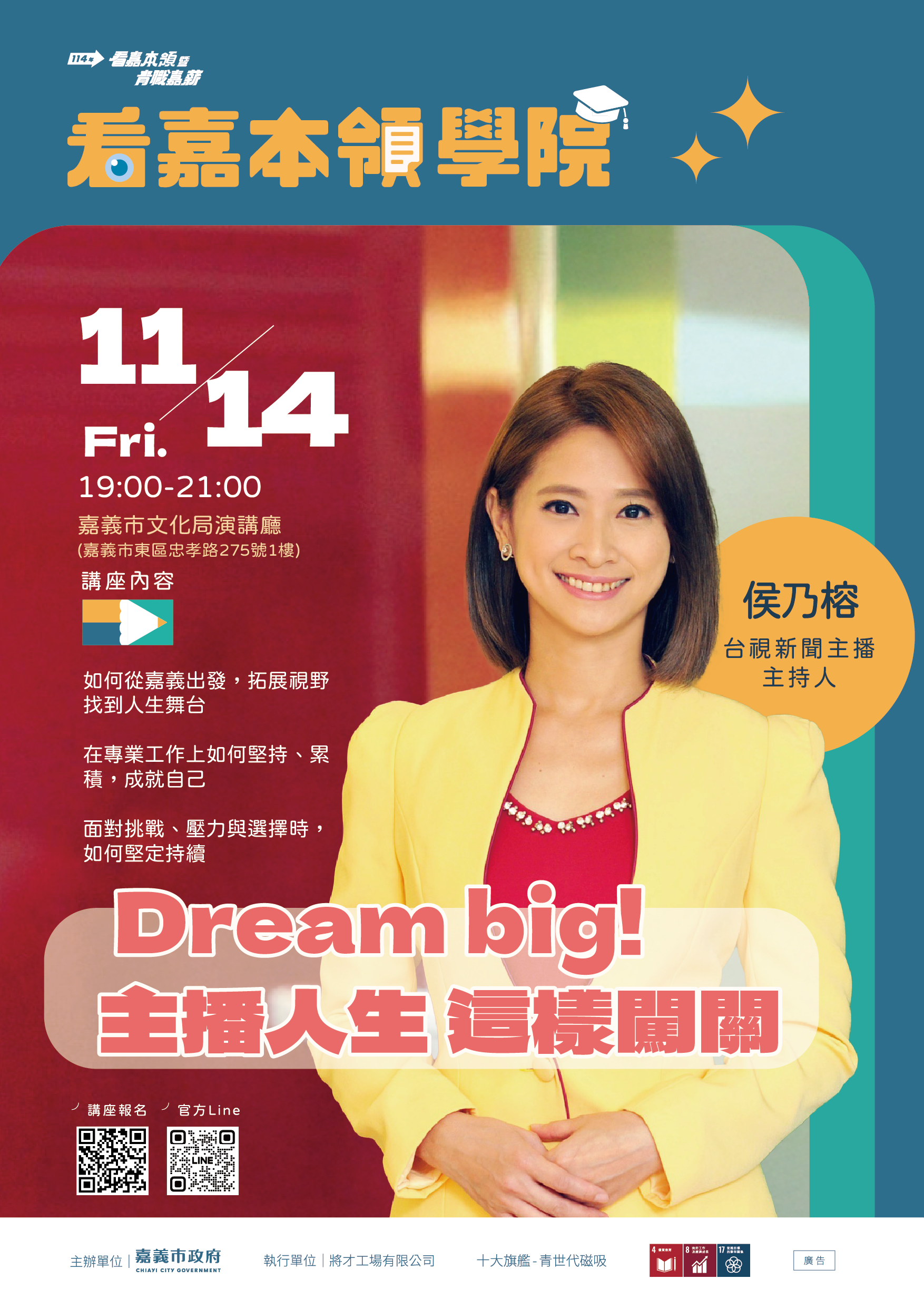 | 公告主旨 | 【名人講座】11/14 (五) Dream Big!主播人生這樣闖關|侯乃榕 / 台視新聞主播、主持人 |