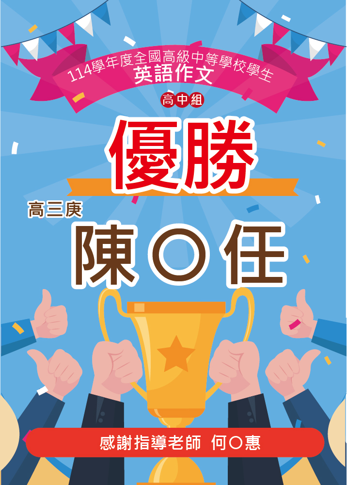 校園公告 公告主旨 本校參加114學年度全國高級中等學校學生英語作文比賽【中區】決賽 榮獲 優勝 發佈日期 2025 年 11 月 01 日 發佈單位 教學組 公告類別 最新消息, 競賽活動&成果, 優異表現, 榮譽榜 公告等級 無 點閱次數 63 公告內容 相關附件 【2025-10-30】Hyread電子書雲端借閱服務