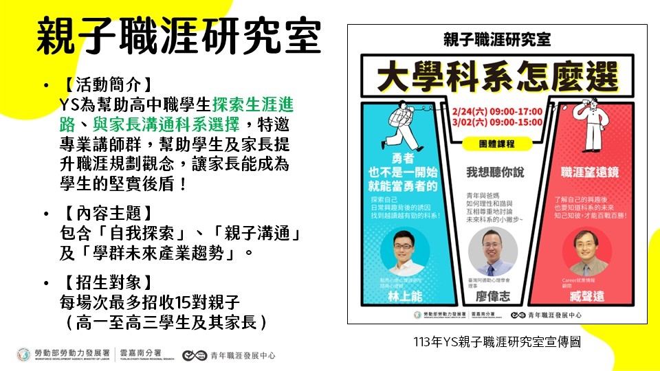 | 公告主旨 | 雲嘉南YS【親子職涯研究室:大學科系怎麼選】 |