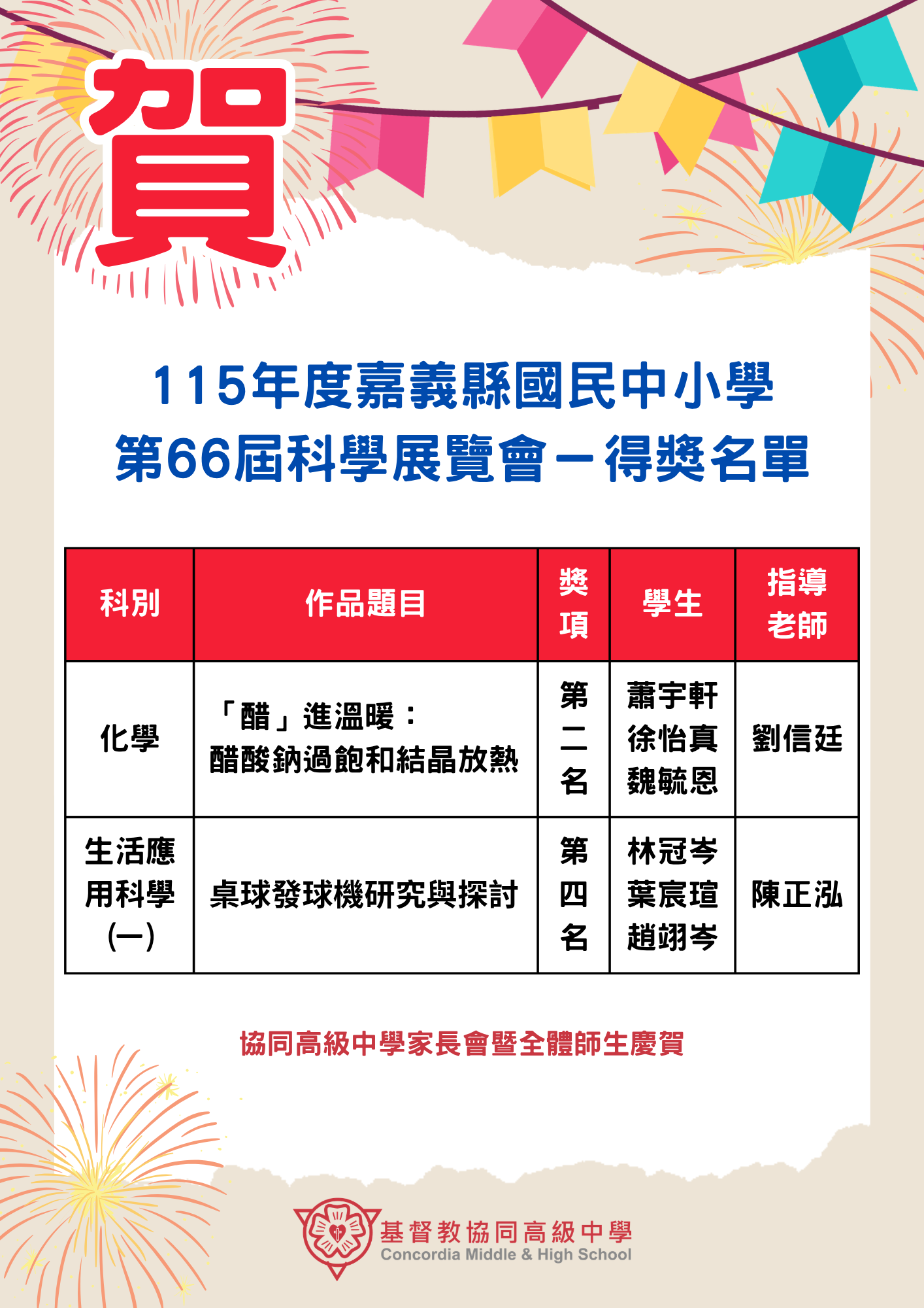 校園公告 公告主旨 賀!本校參加115年第66屆嘉義縣科學展覽表現優異! 發佈日期 2026 年 4 月 01 日 發佈單位 設備組 公告類別 最新消息, 競賽活動&成果, 榮譽榜 公告等級 無 點閱次數 296 公告內容 相關附件 【2026-03-31】國立彰化師範大學檢送114學年度「補助擴增高級中等學校雙語實驗 ...