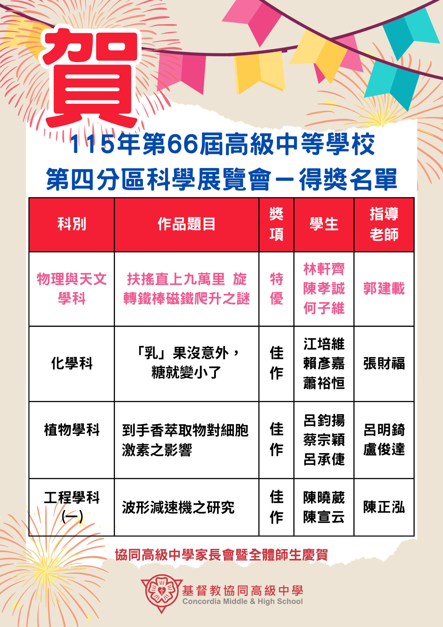 校園公告 公告主旨 賀!本校師生參加第66屆第4區科學展覽成績優異! 發佈日期 2026 年 4 月 15 日 發佈單位 設備組 公告類別 最新消息, 競賽活動&成果, 榮譽榜 公告等級 無 點閱次數 588 公告內容 相關附件 【2026-04-16】114學年度校內語文競賽優勝名單 【2026-04-15】協同中學學生體檢招標