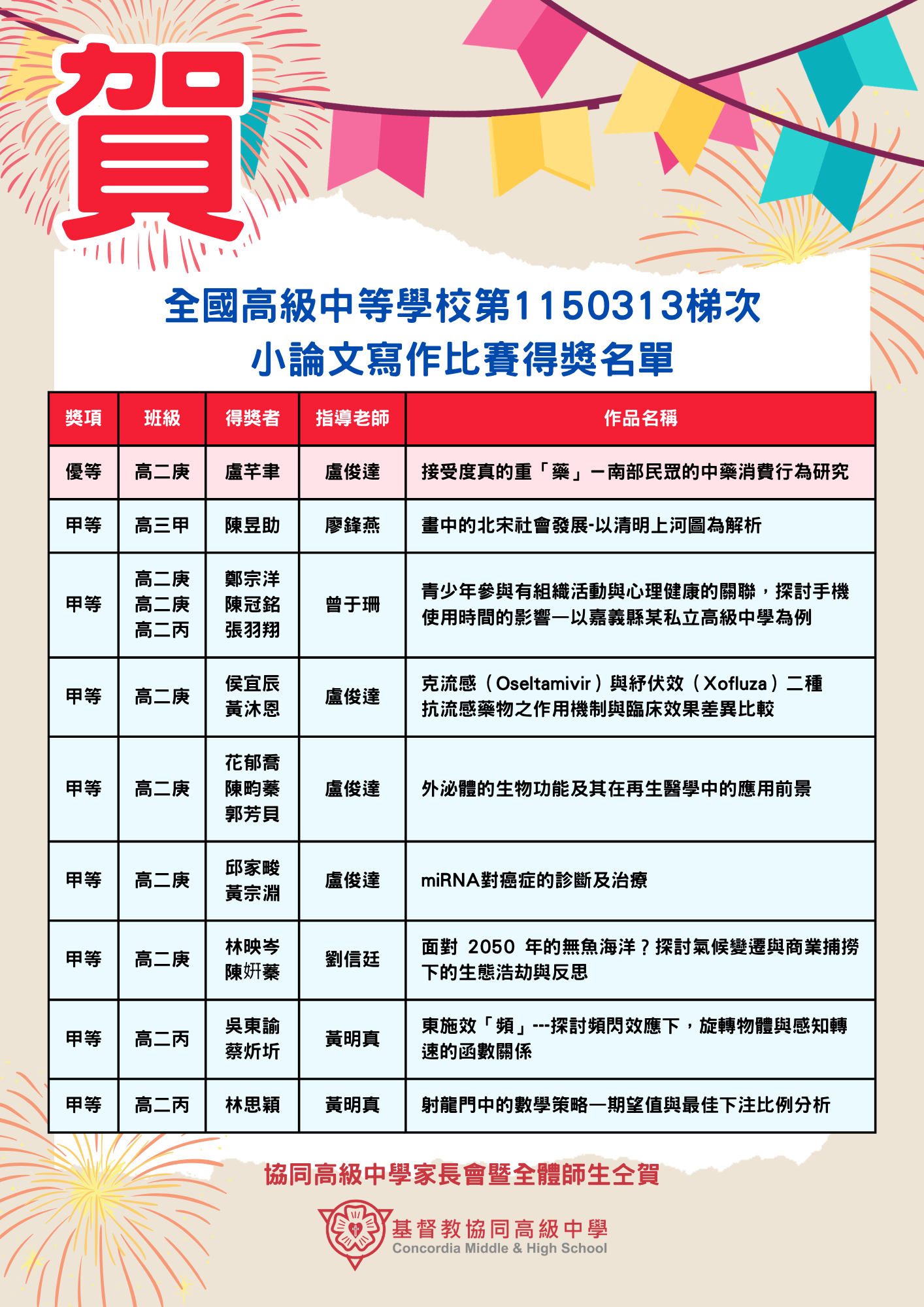 校園公告 公告主旨 賀!本校參加第1150313梯次小論文寫作比賽榮獲佳績 發佈日期 2026 年 4 月 28 日 發佈單位 設備組 公告類別 最新消息, 競賽活動&成果, 榮譽榜 公告等級 無 點閱次數 247 公告內容 相關附件 【2026-04-28】賀!本校參加第1150310梯次閱讀心得寫作比賽榮獲佳績