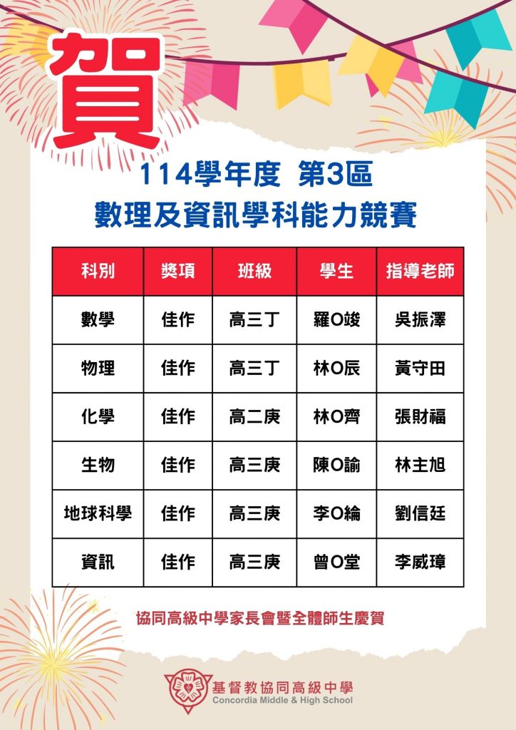 | 2025-11-13 | 賀!本校學生參加114學年度數理及資訊學科能力競賽表現優異 | 最新消息 | 設備組 | 270 |