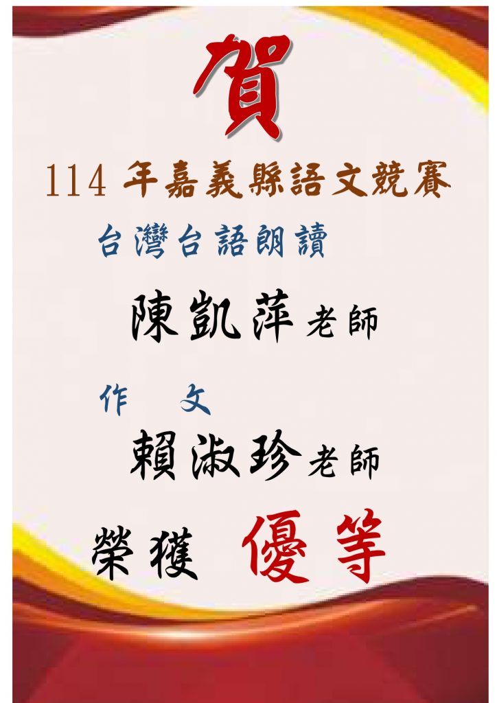 賀! 本校陳凱萍老師、賴淑珍老師參加嘉義縣語文競賽榮獲教師組優等。