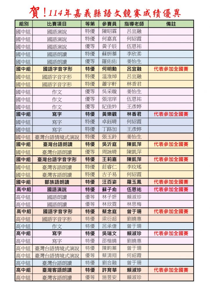 賀~114年嘉義縣語文競賽成績優異!